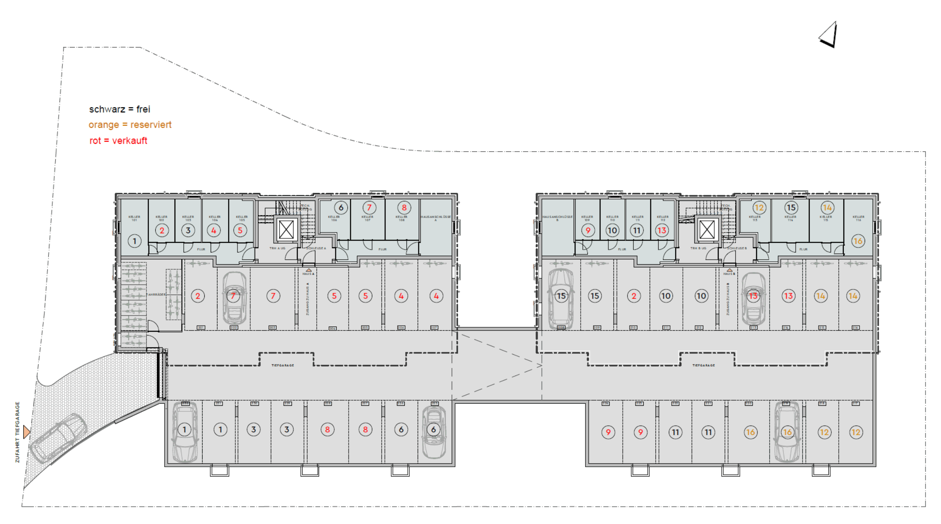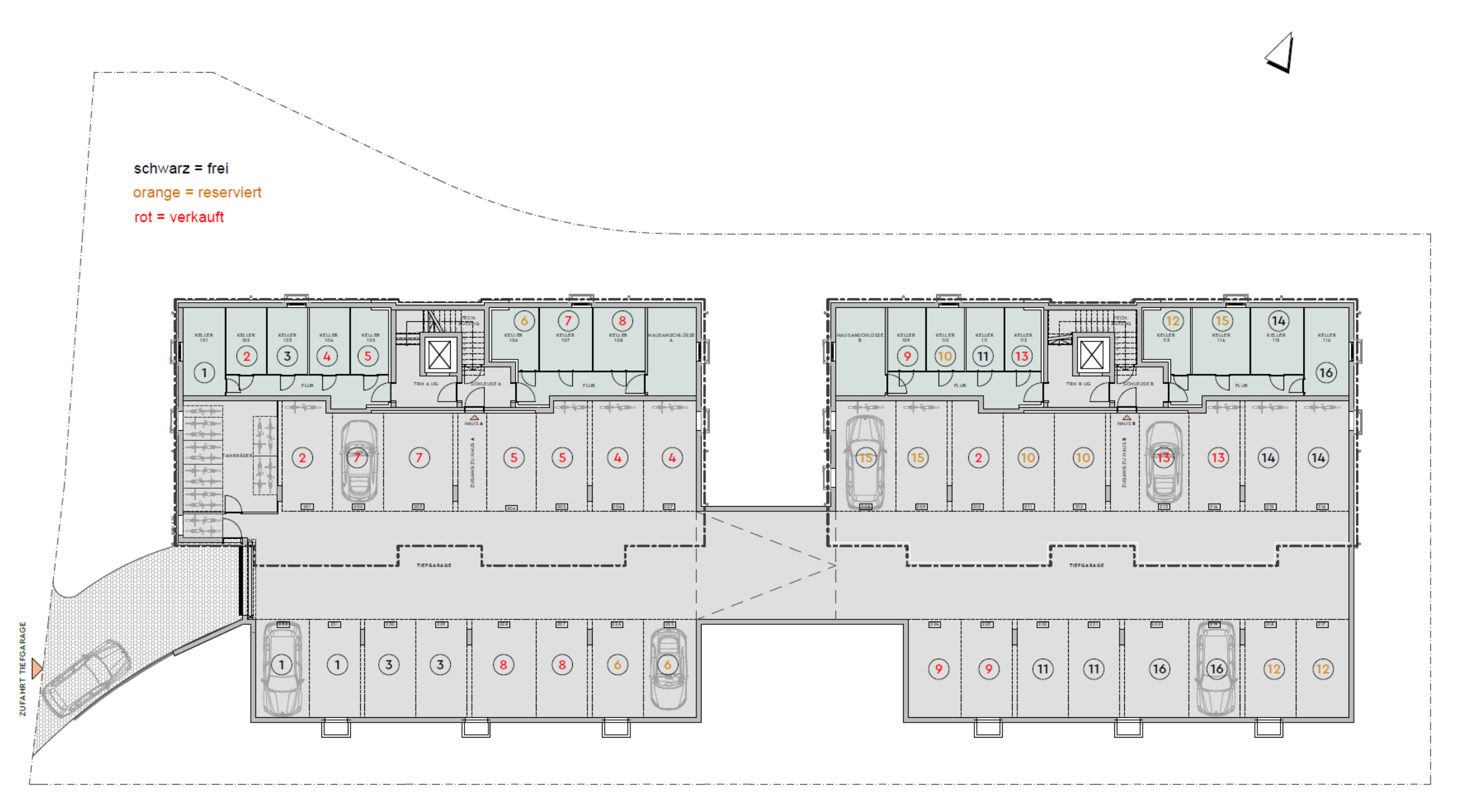 Je Wohnung ist der Kauf von zwei Stellplätzen in der Tiefgarage erforderlich.